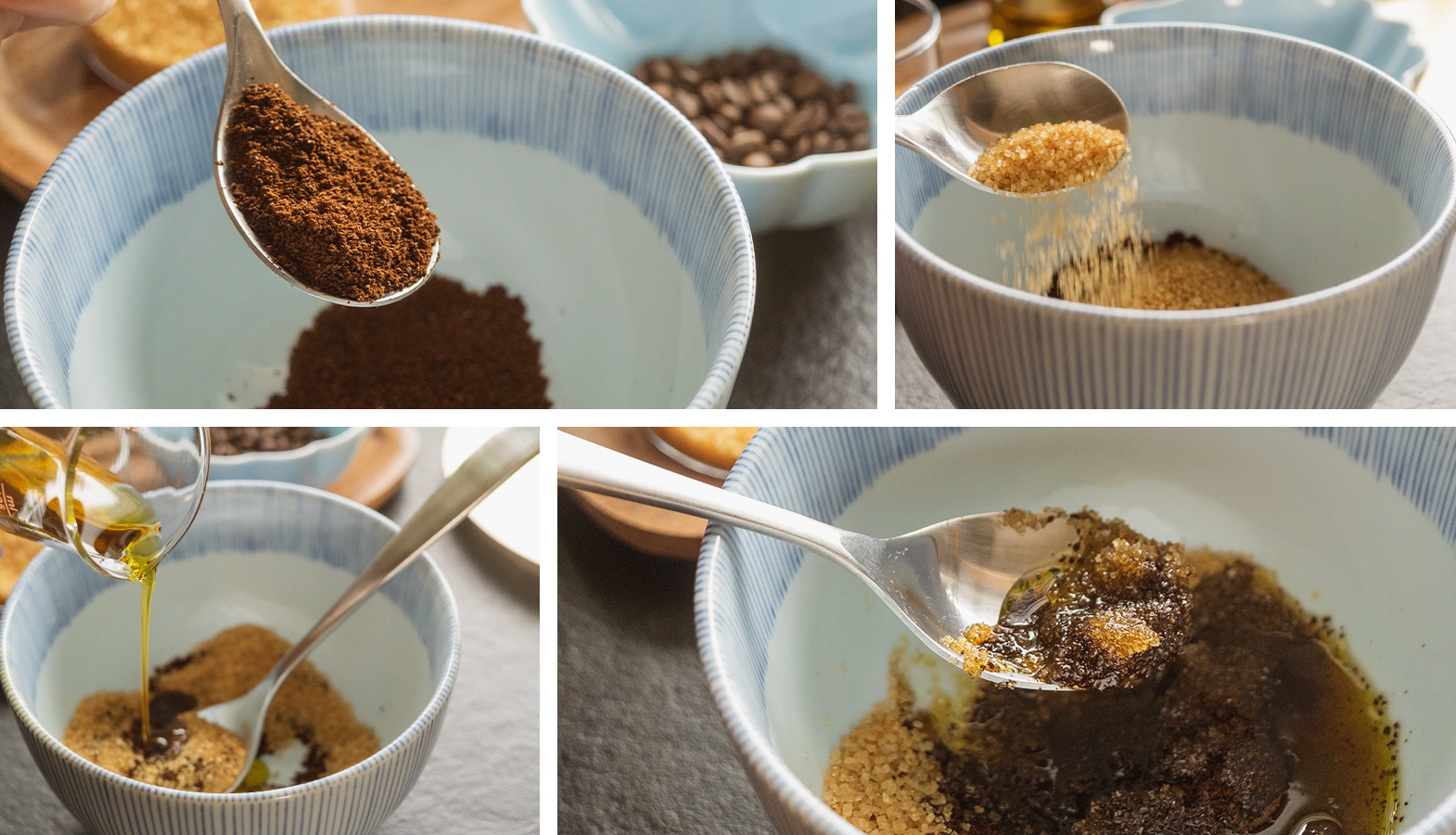 Všechny uvedené ingredience smíchejte dohromady a peeling je připravený k použití. Můžete zužitkovat i kávový lógr, ale já dávám přednost čerstvě mleté kávě, kterou si mohu umlít na co nejjemnější konzistenci. Hlavně proto, abych snížila riziko ucpaného odpadu.